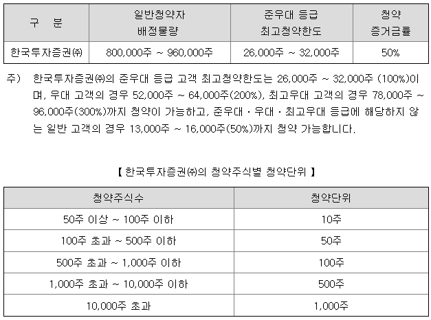 한국투자증권의 일반 청약자 배정 물량은 800,000주 ~ 960,000주이고, 일반 청약자의 최고 청약 한도는 일반 고객 기준 13,000주 ~ 16,000주입니다.