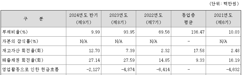 한편 자본의 경우 외부 벤처금융 및 전문투자자로부터의 유상증자, 임직원의 스톡옵션을 제외하면 현재까지 회사가 이익 시현 단계에 있지 않아 결손금이 쌓이는 것으로 인하여 변동되었으며 부채비율은 이에 따른 변화라고 볼 수 있습니다. 자본 잠식률의 경우 '20년까지는 자본잠식 상태였으나, 2021년 모든 우선주 전환에 따라 자본잠식에서 벗어났으며 이후로도 이러한 상태를 유지 중입니다.