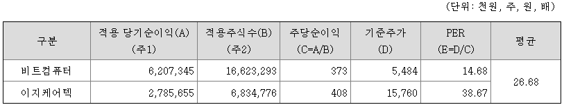 <유사회사의 평균 PER 배수 산정>
