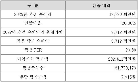 회사의 주당 평가가액은 2028년 추정 순이익을 할인하여 현재가치로 환산한 후, 주식 수로 나누어 주당 순이익을 구하고, 여기에 유사회사의 평균 PER 배수를 곱하여 산출한 것입니다.