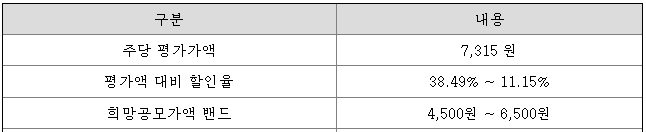 쓰리빌리언의 희망 공모가격은 회사의 주당 평가가액 7,315원에서 11.15% ~ 38.49% 할인한 가격입니다.