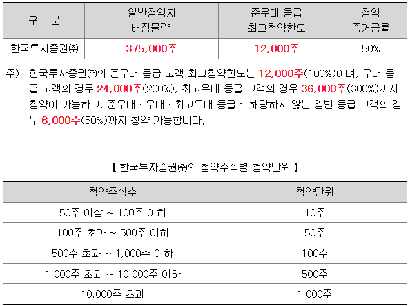 한국투자증권의 일반 청약자 배정 물량은 375,000주이고, 일반 청약자의 최고 청약 한도는 일반 등급 고객 기준 6,000주입니다.