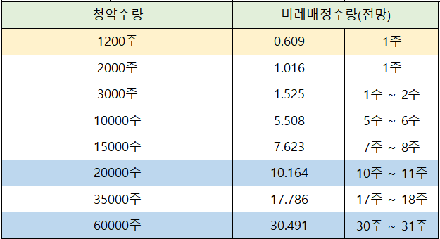 일반청약자의 최고 청약 한도인 20,000주까지 청약 신청한 경우에는 10주 ~ 11주 배정이 예상되며, 우대등급의 최고 청약 한도인 60,000까지 풀 청약 신청한 경우에는 30주 ~ 31주 배정이 전망됩니다