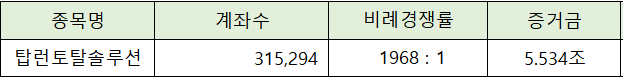 탑런토탈솔루션의 청약에는 5.534조원의 증거금이 모이면서 1,968 : 1의 비례 경쟁률을 나타냈습니다.