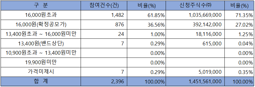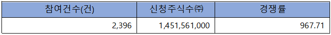수요예측 참여 건수는 총 2,396건에 신청 주식수 1,451,561,000주로, 참여 경쟁률 967.71 : 1의 실적을 기록했습니다.