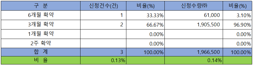 의무 보유 확약 건수는 3건에 1,966,500주로 전체 신청 물량 대비 건수로는 0.13%, 수량으로는 0.14%였으나, 신청 수량이 적어 큰 의미가 없다고 하겠습니다.