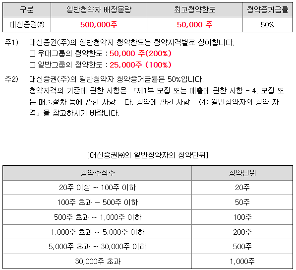 신증권의 일반 청약자 배정 물량은 500,000주이고, 일반 청약자의 최고 청약 한도는 일반그룹 고객 기준 25,000 주입니다.