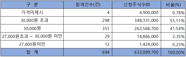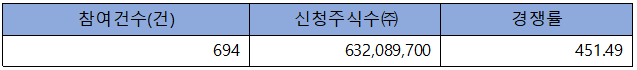 수요예측 참여 건수는 총 694건에 신청 주식수 632,089,700주로 451.49 :1의 경쟁률을 기록했습니다.