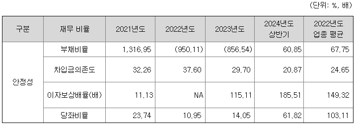 동사의 부채비율은 전환상환 우선주의 보통주 전환 이후 개선되고 있으며, 차입금 의존도는 업종 평균과 유사한 수준을 기록하고 있습니다.
