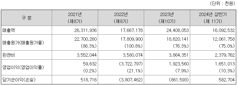 2022년의 적자는 2022년 첫 생산을 시작한 제품의 수율이 높은 관계에 따른 것으로, 이후 수율 안정화 및 원가절감으로 수익성을 회복하였습니다.