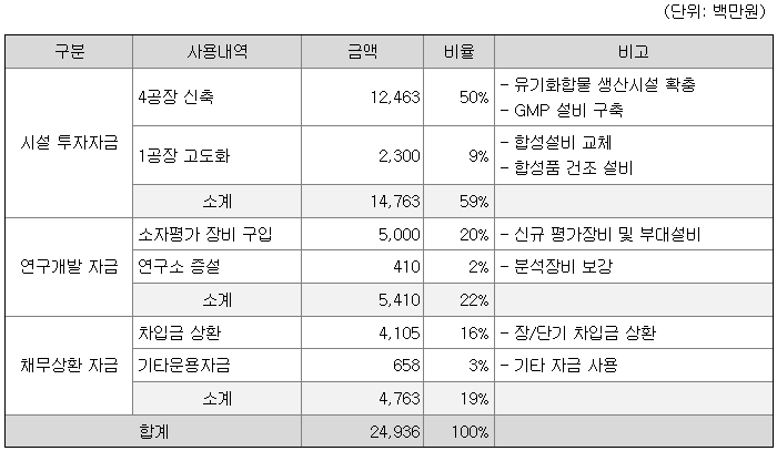 에스켐은 금번 공모를 통해 조달된 자금으로 4공장 신축과 1 공장 고도화 등 시설 투자 자금으로 148억, 연구개발비로 54억을 사용하고 나머지 48억으로 차입금 상환 및 운용자금으로 사용할 계획입니다.