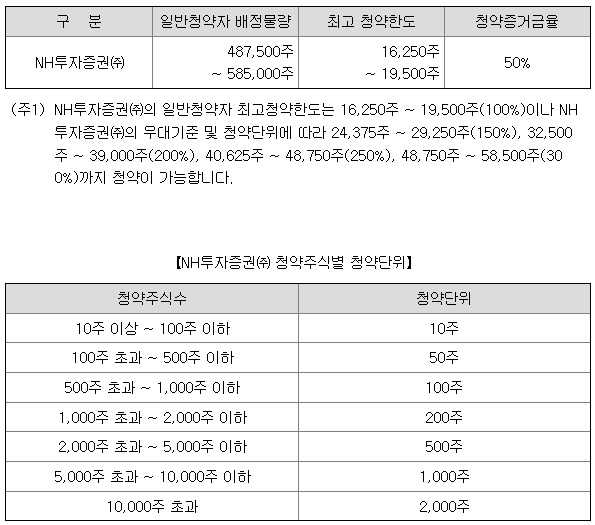 NH투자증권의 일반 청약자 배정 물량은 487,500주 ~ 585,000주이고, 일반 청약자의 최고 청약 한도는 일반 고객 기준 16,250주 ~ 19,500주입니다.