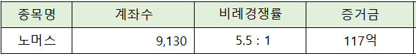 노머스의 청약에는 117억원의 증거금이 모이면서 5.5 : 1의 비례 경쟁률을 나타냈습니다.