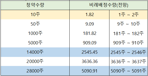비례배정의 경우 1주 배정을 기대해볼 수 있는 커트라인은 10주로 전망되고 있습니다.