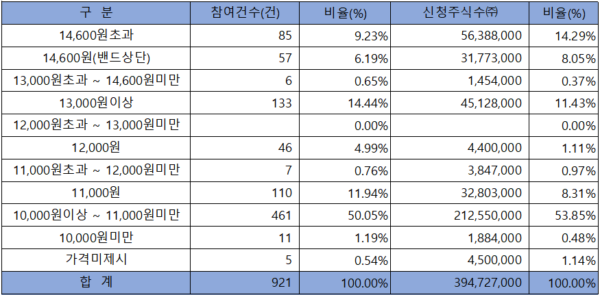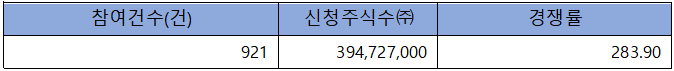 수요예측 참여 건수는 총 921건에 신청 주식수 394,727,000주로, 참여 경쟁률 283.90 : 1의 실적을 기록했습니다.