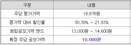 당초 희망 공모가격 하단 13,000원 대비 3,000원(23.08%) 하향 조정된 가격입니다.