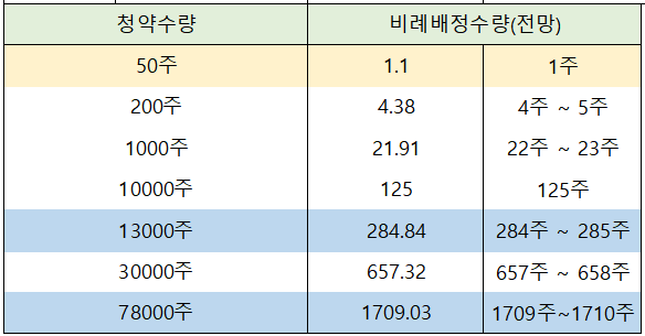 일반청약자의 최고 청약 한도인 13,000주까지 신청한 경우에는 284주 ~ 285주 배정이 예상되며, 우대등급의 최고 청약 한도인 78,000주까지 풀 청약 신청한 경우 1,709주 ~ 1,710주 배정이 전망되고 있습니다.