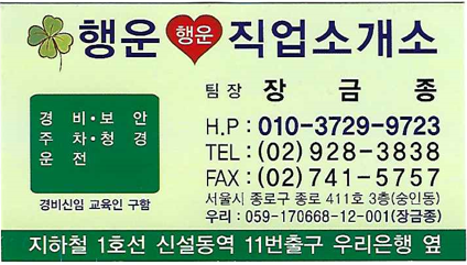 위의 서비스를 제공하는 곳은 종로구 숭인동에 위치한 행운 직업소개소이고, 담당은 장금종 팀장입니다.