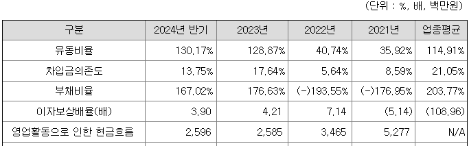 동사의 부채비율은 2023년 전환상환우전주의 보통주 전환 이후 개선되었습니다.