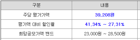 미트박스글로벌의 희망 공모가격은 회사의 주당 평가가액 39,208원에서 27.31% ~ 41.34% 할인한 가격입니다.
