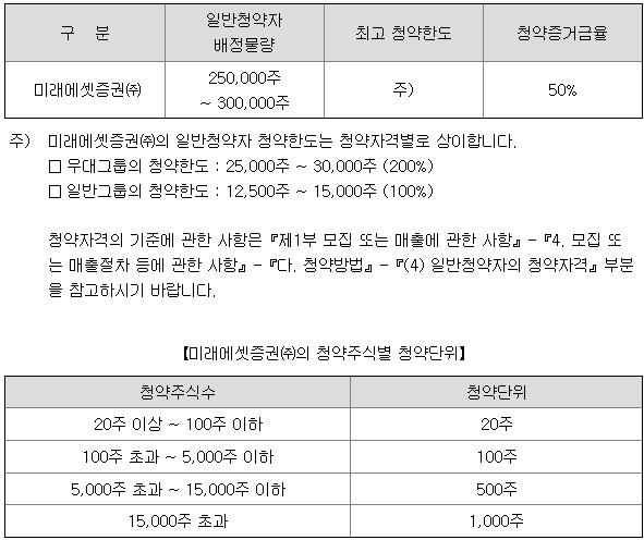 미래에셋증권의 일반 청약자 배정 물량은 250,000주 ~ 300,000주이고, 일반 청약자의 최고 청약 한도는 일반 그룹 기준 12,500주 ~ 15,000주입니다.