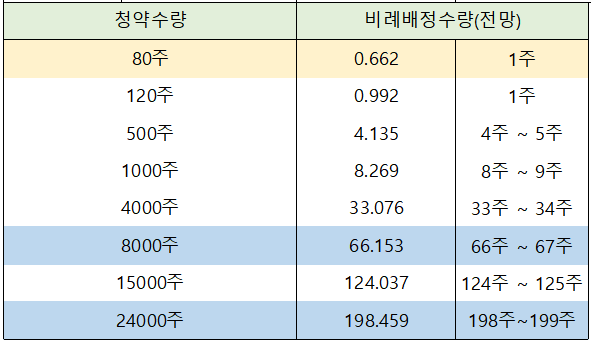 비례배정의 경우 1주 배정을 기대해 볼 수 있는 커트라인은 80주로 전망되고 있습니다.