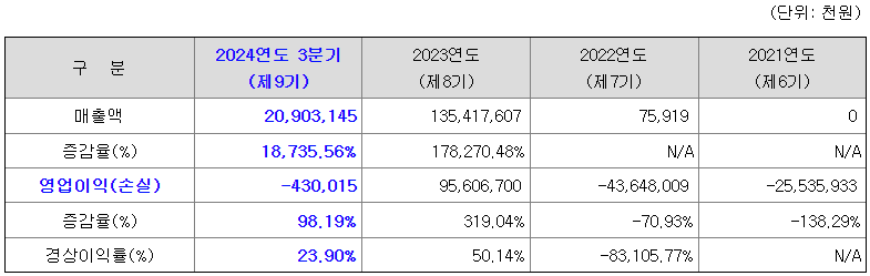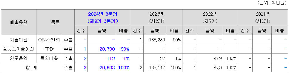 오름테라퓨틱은 2023년과 2024년에 2건의 기술 이전 계약을 성사시켰습니다. 이에 따라 2023년도에 178,270% 의 매출액 증감률 및 319%의 영업이익 증가율을 기록하였습니다. 2024년도 3분기 기준 재무제표 상 2024년 7월 발생한 Vertex 플랫폼 기술이전 수익이 반영되었습니다.