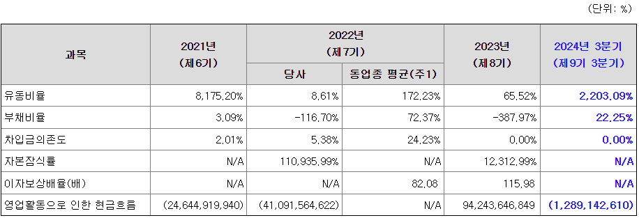동사는 2024년 3분기 기준 유동비율 2,203.09%, 부채비율 22.25%,2023년 말 기준 유동비율 65.52%, 부채비율 -387.97%를 기록하며 재무 위험이 매우 낮다고 볼 수 있습니다. 차입금 의존도 역시 2023년 이후 0.00%를 기록하며 안정적인 재무상태를 유지하고 있습니다.