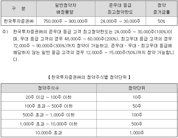한국투자증권의 일반 청약자 배정 물량은 750,000주 ~ 900,000주이고, 일반 청약자의 최고 청약 한도는 일반 등급 고객 기준 12,000주 ~ 15,000주입니다.