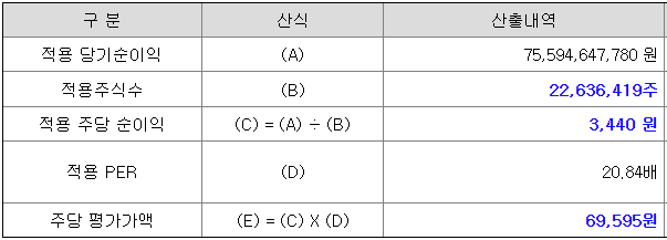 회사의 주당 평가가액은 2024년 반기 기준 직전 12개월의 순이익을 주식 수로 나누어 주당 순이익을 구하고, 여기에 유사회사의 평균 PER배수를 곱하여 산출한 것입니다.