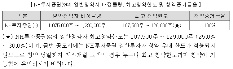 NH투자증권의 일반청약자 배정은 1,075,000주 ~ 1,290,000주이고, 일반 청약자의 최고 청약 한도는 107,500주 ~ 129,000주입니다.