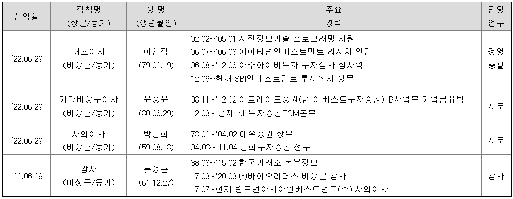동사는 SBI인베스트먼트의 투자 심사 담당 상무 이 인직 대표이사 등 투자 업계 전문가들로 경영진을 구성하고 있습니다.