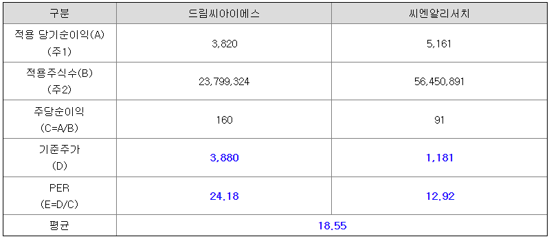 <유사회사의 평균 PER 배수 산정>