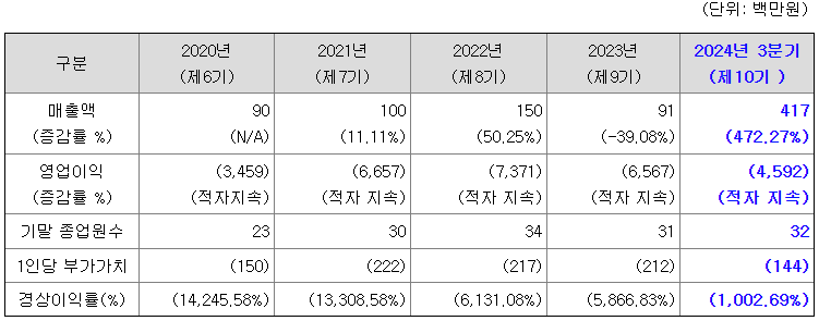 동사는 2021년 중 상환전환우선주의 보통주 전환으로 자본잠식이 해소되었으며, 이후 1) 연구 개발 업종의 특성상 현재 수익이 미실현된 상태인 반면 지속적으로 영업비용이 소요되어 영업적자가 지속되어 이익잉여금이 감소, 2) 2022년 전환우선주 약 16억원 발행에 따라 발행금액이 K-IFRS 회계기준 상 부채로 계상됨에 따라 부채비율이 상승하였습니다. 동사의 2024년 3분기 부채비율 9.57%은 동업종 평균 141.74% 대비 우위에 있으며, 향후 공모자금 유입에 따른 자본 확충 효과 등으로 더욱 개선될 수 있을 것이라고 이야기하고 있습니다.