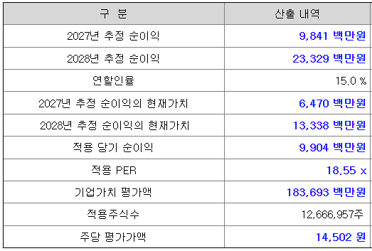 회사의 주당 평가가액은 2027년과 2028년 추정 순이익을 할인하여 현재가치로 환산한 후, 유사회사의 평균 PER 배수를 곱하여 회사가치를 정하고, 이를 주식 수로 나누어 산출한 것입니다.