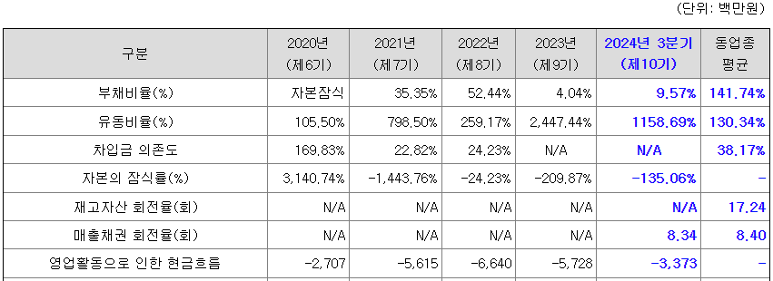 동사의 부채비율은 자본잠식이 해소된 2021년 35.35%, 2022년 52.44%, 2023년 4.04%, 2024년 3분기 9.57%입니다.