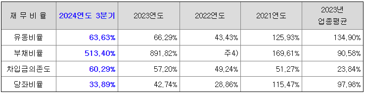 2021년 부채비율은 K-GAAP 기준 169.61%였으나, 이후 K-IFRS 전환으로 RCPS 평가 반영에 따른 금융부채 증가, 주식보상비용 인식, 시설 투자 등을 위한 차입금의 증가 등의 사유로 동사의 부채비율은 높은 편을 유지하고 있습니다. 2024년 제3자 배정 투자 유치에 따라 자기 자본이 증가하여 2024년 3분기 K-IFRS 기준 부채비율은 개선되어 513.40%를 기록하고 있습니다.
