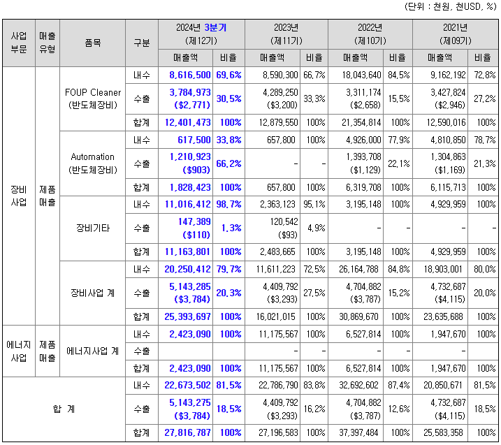 동사의 장비사업은 반도체 장비를 중심으로, OLED, LCD, 자동차 등 다양한 기타 산업에 사용되는 장비 및 부품을 판매하는 사업입니다. 특히, 반도체 장비사업은 최근 3 사업연도 및 당해 사업연도 3분기까지의 합산 매출액 기준으로 당사 매출의 약 70%를 차지하는 주력 사업입니다. FOUP Cleaner를 주축으로 해서, Sorter, EFEM, Shelf, 반도체부품 등을 판매하고 있며, 주요 거래처는 SK하이닉스, 삼성전자, SK실트론, Soitec 등의 다양한 글로벌 고객을 확보함으로써 안정적인 매출을 실현하고 있습니다.
