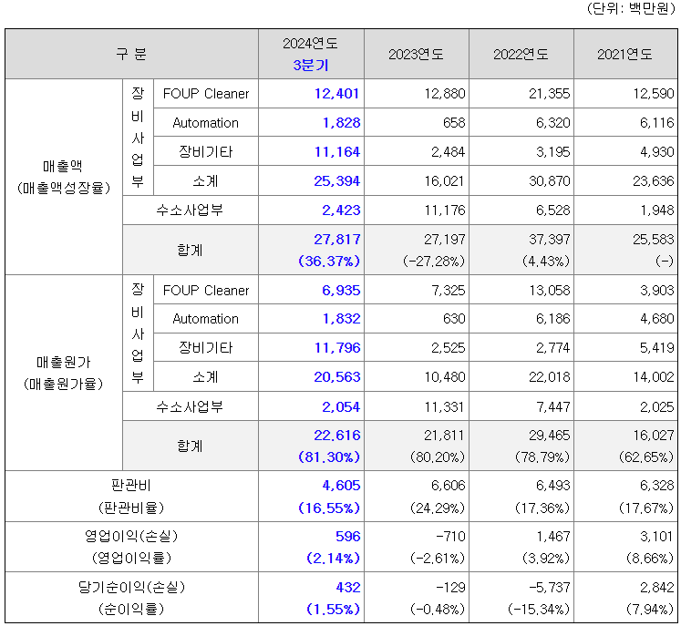 그동안 주력 사업이었던 Wafer를 담는 용기 FOUP Cleaner의 매출액은 감소 추세이지만, 차세대 반도체 장비의 정상화를 통해 성장을 이어나갈 계획을 가지고 있습니다.