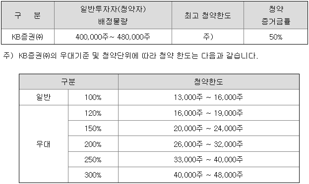 KB증권의 일반 청약자 배정 물량은 400,000주 ~ 480,000주이고, 일반 청약자의 최고 청약 한도는 일반 고객 기준 13,000주 ~ 16,000주입니다.