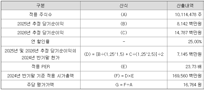 회사의 주당 평가가액은 2025년과 2026년 추정 순이익을 할인하여 현재가치로 환산한 후, 여기에 유사회사의 평균 PER 배수를 곱하여 회사기치를 구하고, 이를 주식 수로 나누어 산출한 것입니다.
