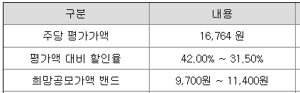아이에스티이의 희망 공모가격은 회사의 주당 평가가액 16,764원에서 31.50% ~ 42.00% 할인한 가격입니다.