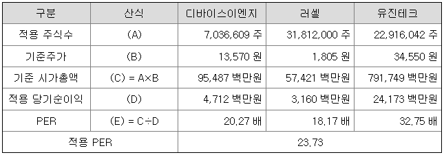 회사의 주당 평가가액은 2025년과 2026년 추정 순이익을 할인하여 현재가치로 환산한 후, 여기에 유사회사의 평균 PER 배수를 곱하여 회사기치를 구하고, 이를 주식 수로 나누어 산출한 것입니다.