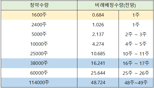 일반청약자의 최고 청약 한도인 38,000주까지 청약 신청한 경우에는 16주 ~ 17주 배정이 예상되고, 우대 등급의 최고 청약 한도인 114,000주까지 풀 청약 신청한 경우에는 48주 ~ 49주 배정이 전망됩니다.