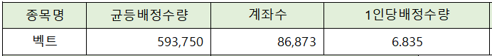 균등배정은 총 86,873 계좌가 청약에 참가해 균등 배정 수량 593,750주를 감안하면 1인당 6.835주가 배정될 것으로 전망되고 있습니다.