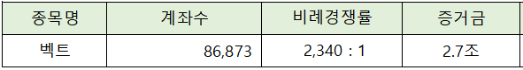 벡트의 청약에는 2.7조원의 증거금이 모이면서 2,340 : 1의 비례 경쟁률을 나타냈습니다.