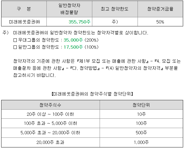 미래에셋증권의 일반 청약자 배정 물량은 355,750주이고, 일반 청약자의 최고 청약 한도는 일반그룹 기준 17,500주입니다.