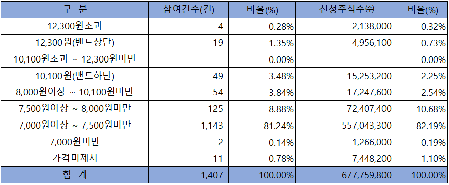희망 공모가격 상단 이상 신청 비율은 1.05%에 불과했으며, 7,000원에서 7,500원 사이 신청 비율이 82.19%에 달했습니다.
