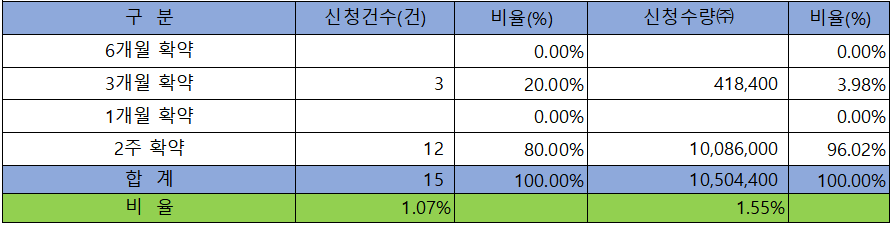 의무 보유 확약 건수는 15건에 10,504,400주로 전체 신청 물량 대비 건수로는 1.07%, 수량으로는 1.55%였습니다.