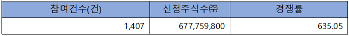 수요예측 참여 건수는 총 1,407건에 신청 주식수 677,759,800주로, 참여 경쟁률 635.05 : 1의 실적을 기록했습니다.